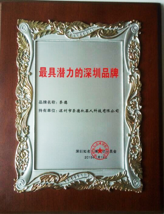 作為行業內唯一獲得深圳知名品牌的深圳本土民族品牌,深圳市榮德機器人科技有限公司自創立以來,一直非常注重品牌建設工作,并成功導入卓越績效管理模式,并于2013年獲得了“廣東省名牌產品”的榮譽稱號,成為行業內第一家獲此殊榮的領軍企業。借此獲得深圳知名品牌之際,榮德機器人將狠抓產品質量,為響應習總書記三個轉變的重要思想將中國機器人民族品牌做大做強,為振興民族工業、提升民族品牌、替代進口品牌作出企業應盡的努力。
