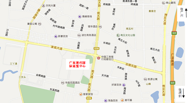 深圳或廣州方向走廣深高速厚街出口下高速,轉“博覽大道”再轉“會展東路”,到達莞太路和家具大道交叉處即到。導航:廣東現代國際展覽中心、嘉華大酒店