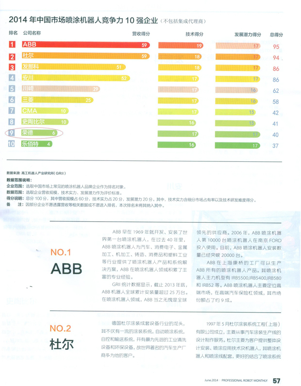 日前,國內某權威機器人產業雜志對2014年中國市場噴涂機器人的核心市場競爭力進行了深入了解并根據各企業營收、技術、發展潛力三項重要指標進行評分,并得出最終排名,榮德公司在所有入圍的十家企業里面排名第九,排名前八名的均為國外巨頭,榮德公司在中國國內的排名中處于第一名的領先地位,這也符合榮德公司“中國噴涂機器人領先品牌”的戰略地位。